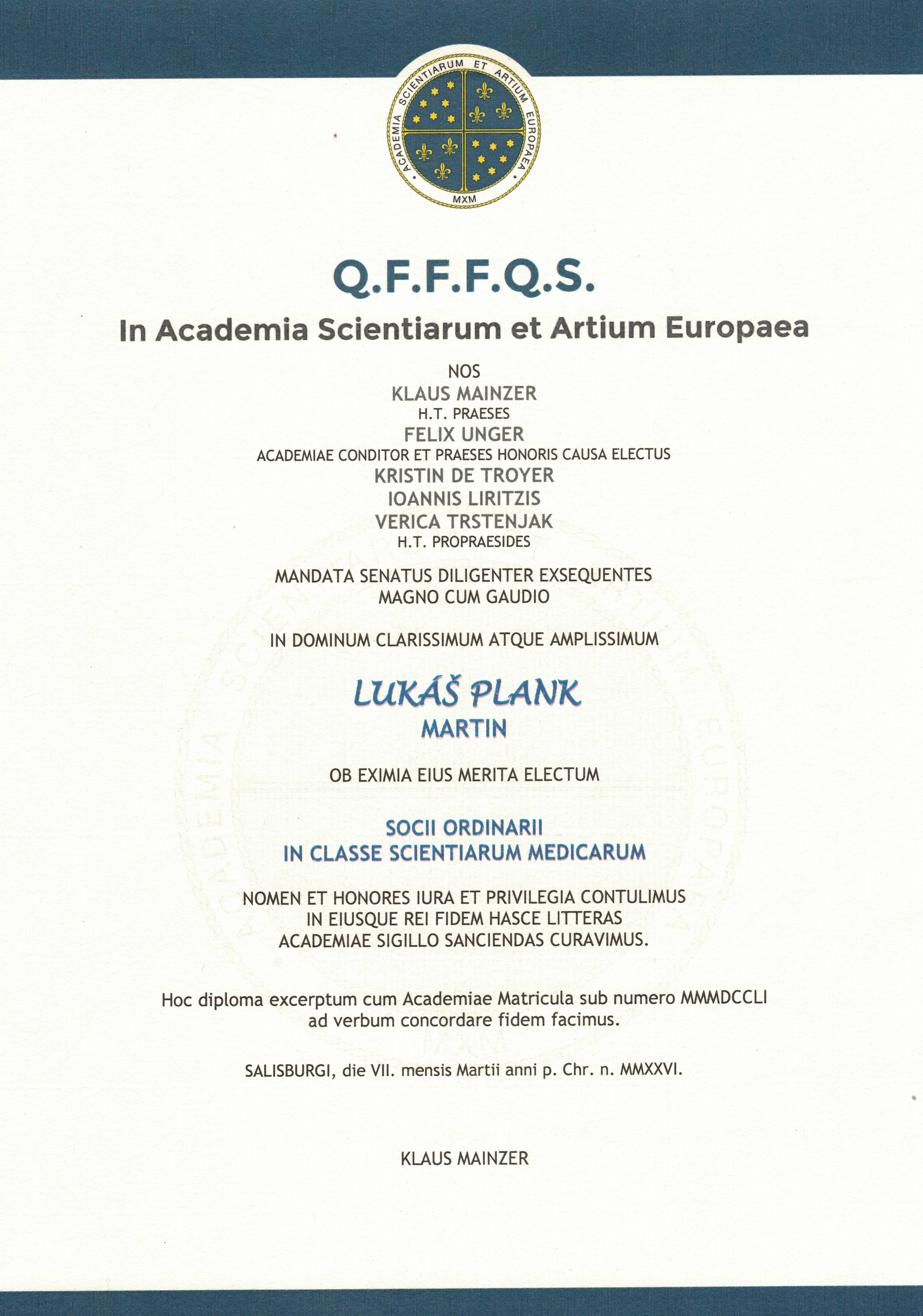 Na začiatku marca sa profesor Plank osobne zúčastnil slávnostného zasadnutia akadémie v jej sídle na univerzite v Salzburgu, kde prebral inauguračný dekrét. Ide o významné ocenenie práce, ktoré sa udeľuje osobnostiam s výnimočnými výsledkami vo vede, umeleckej tvorbe, manažmente či v ďalších oblastiach spoločenského života.